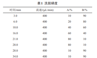 安捷倫Eclipse XDB-C18反相色譜柱 (4.6 mm×150 mm,3.5 µm),柱溫 40℃,流動(dòng)相 A:B=乙 腈(: 水/0.1%甲酸),洗脫梯度見(jiàn)表1,進(jìn)樣體積10 µL。