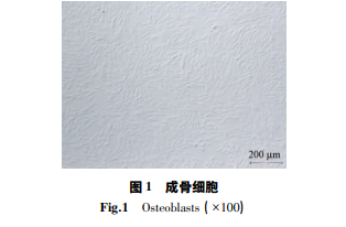 無菌條件下取出出生 72 h 的 SD 乳鼠頭骨,置 入 4°C 的 PBS 溶液中,然后應(yīng)用眼科鑷與手術(shù)刀剔 除表面的結(jié)締組織,用 4°C 的 PBS 溶液反復(fù)吹打清 洗組織并將其剪成小于 1 mm3 的組織塊,將剪好的 組織塊轉(zhuǎn)移到 1. 5 mL 離心管中,加 3 倍體積的胰 酶,將離心管置入 37 ℃ 的脫色搖床(TS-1000型)中進行消化,振 蕩消化 20 min 后加入胎牛血清終止消化,放置于 4 ℃ 冰 箱 中 靜 置 5 min,舍 棄 上 清 液,加 入 0. 2% Collagenase I,置于 37 ℃的脫色搖床中,消化并振蕩 60 min 后用胎牛血清終止消化,多次吹打后通過 200 目濾網(wǎng)過濾去除碎片,收集濾液,1 200 r /min 離心 8 min,棄上清液,用 DMEM 完全培養(yǎng)基進行重 新懸浮細胞,置于 37 ℃,5% CO2 培養(yǎng)箱中進行培 養(yǎng); 2 d 后換液,之后間隔 2 ~ 3 d 換 1 次培養(yǎng)液。并在倒置顯微鏡下觀察細胞形態(tài)及生長情況,取培養(yǎng) 的第三代成骨細胞進行后續(xù)實驗。
