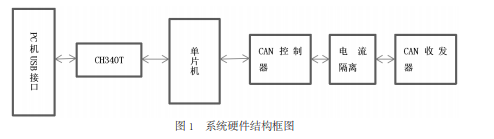 (三)系統硬件結構 本文設計的 CAN/USB 轉接器以 51 單片 機為核心。由單片機負責接收其中一個總線 上的信號,并將其轉發到另一個總線上,同 時也由單片機負責對來不及發送的數據進行 緩存。前者要求單片機有足夠快的處理速度, 后者則要求單片機有盡可能大的 RAM 空間。 51 單片機既沒有對 CAN 總線的支持,也沒 有對 USB 總線的支持,因此這兩種總線都需 要用專門接口額外連接相應的轉接芯片。常 見的 USB 轉接芯片是 CH340 系列,它可以將 USB 接口和 UART 串口的數據進行轉換。而 CAN 總線的硬件部分通常由處理器、CAN 控 制器和 CAN 收發器三部分構成。這里讓單片 機通過 UART 接口連接 USB 轉串口芯片;通 過 P0 和 P2 兩個擴展存儲器接口連接 CAN 控 制器,CAN 控制器通過光耦合器與 CAN 收發器連接以實現信號隔離,避免干擾。硬件框 圖如下圖 1。
