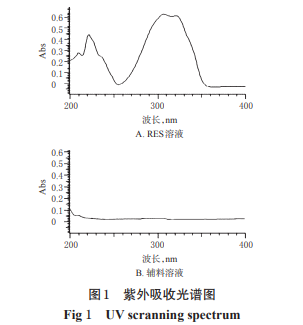 取干燥至恒質(zhì)量的 RES 對(duì)照品適量,置于量瓶中,加 1%醋酸 10 mL,超聲(功 率:180 W,頻率:59 kHz,時(shí)間:2 min,下同)溶解,并用 無水乙醇稀釋成質(zhì)量濃度為5 μg/mL的溶液,同法配制 相應(yīng)濃度的輔料溶液,采用紫外分光光度法,在 200~ 400 nm 波長范圍內(nèi)進(jìn)行紫外掃描。結(jié)果顯示,RES 在 307 nm波長處有最大吸收,輔料對(duì)其測定無干擾,故選 擇307 nm 波長作為 RES 的含量測定波長。